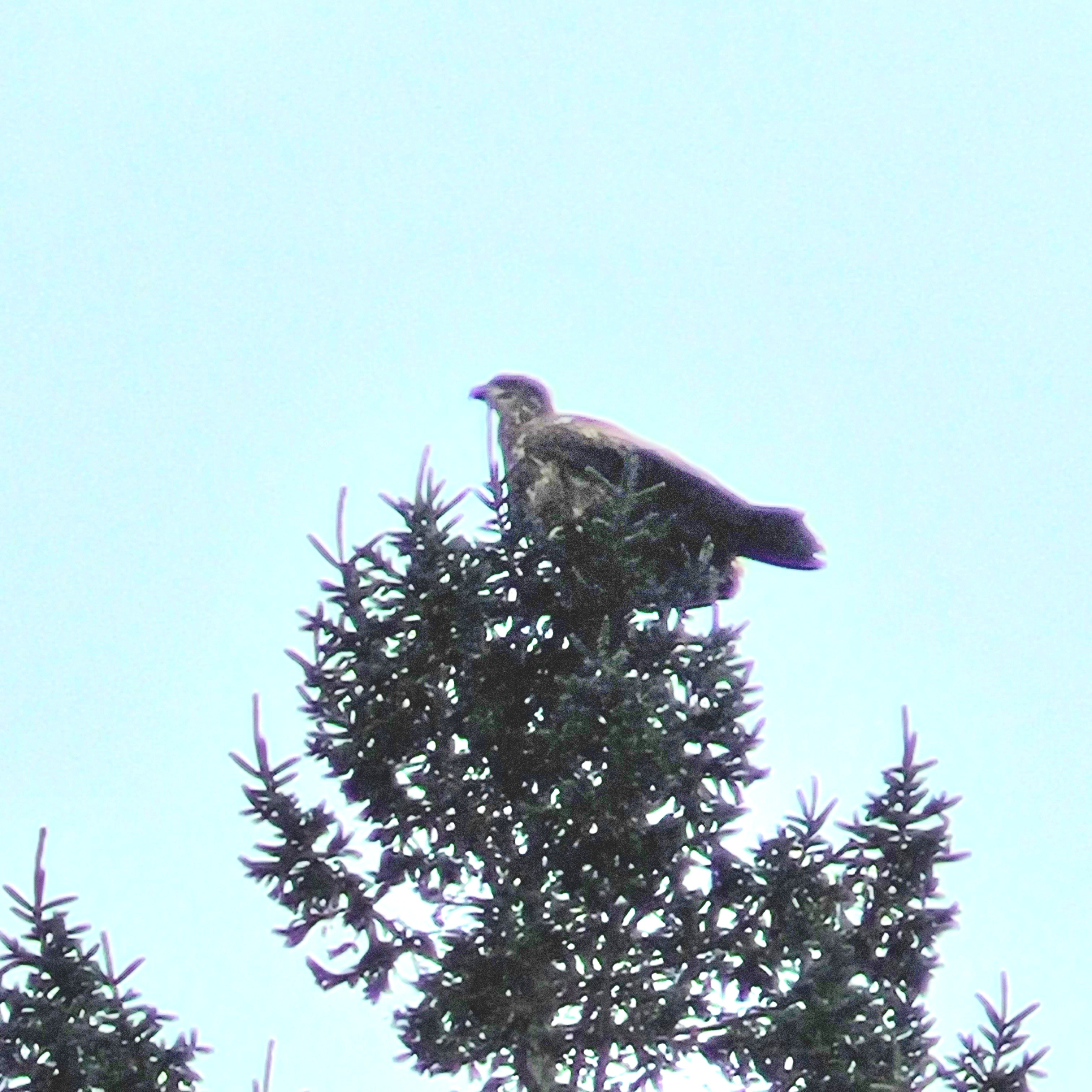 An immature (>2 years old) bald eagle perched on our spruce tree.