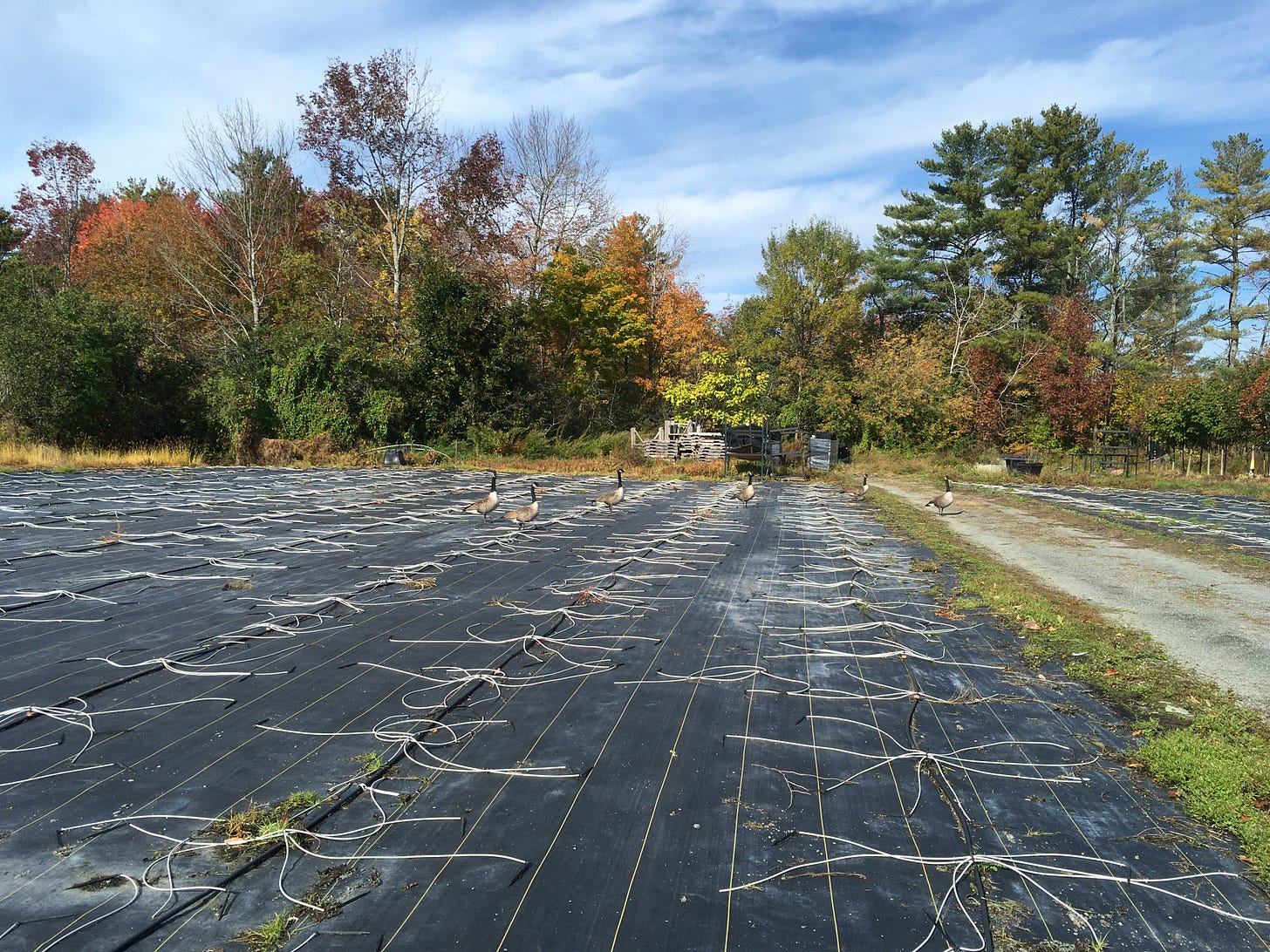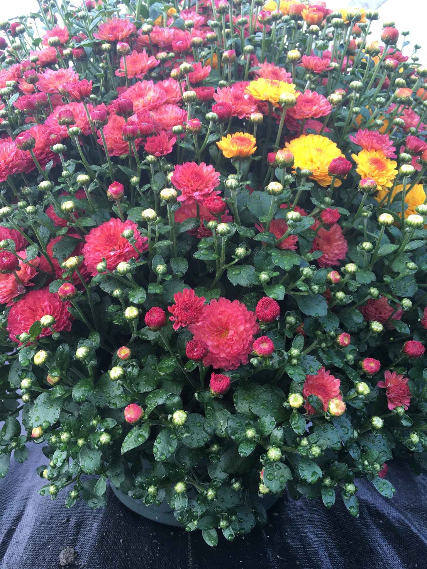 I noticed the irony of walking on black weed fabric in 90+ degree weather, sweating profusely. I was caring for a plant that wouldn’t bloom until late August or September. Their fall blooms required a cold snap or drastic reduction in their fertilizer—stressors made them bloom. 👈